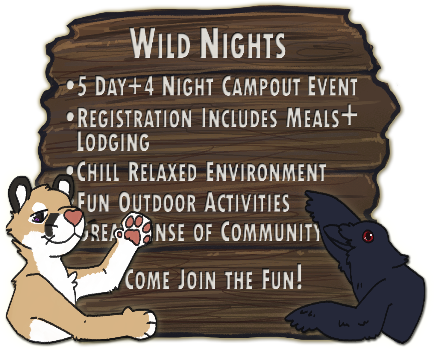 Wild Nights 2025 will be held at Robbers Cave State Park, Group Camp #2, April 24th through April 29th, 2025. The theme this coming year is Under the Stars, chosen by our Guest of Honor Noxychu! Hope to see everyone there!