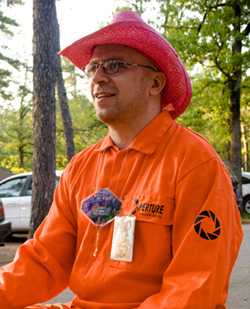 Thirteen years after picking RhubarbCub as a screen name in response to the then-new "bear" scene, he watched "that infamous CSI episode" and immediately knew that the writers had gotten something wrong because who would bother going to such a grim, dreary event as "PAFCon"? In October 2009, enlightened by his own recent plunge into the fandom and spurred on by a looming deadline, he wrote what would become the opening song to "Julie Bunny Must Die!", his furry-influenced stage musical which garnered positive reviews at the Orlando Fringe Festival 2010 despite his having never attended an actual convention. Wild Nights 2011, his second convention, was the first of what he hopes will be a long and distinguished list of conventions to host "the bunny".